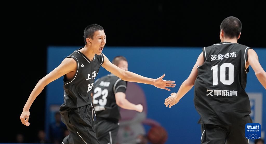 11月18日,上海队球员杨易轩(左)与张懿赵杰在获胜后庆祝。
