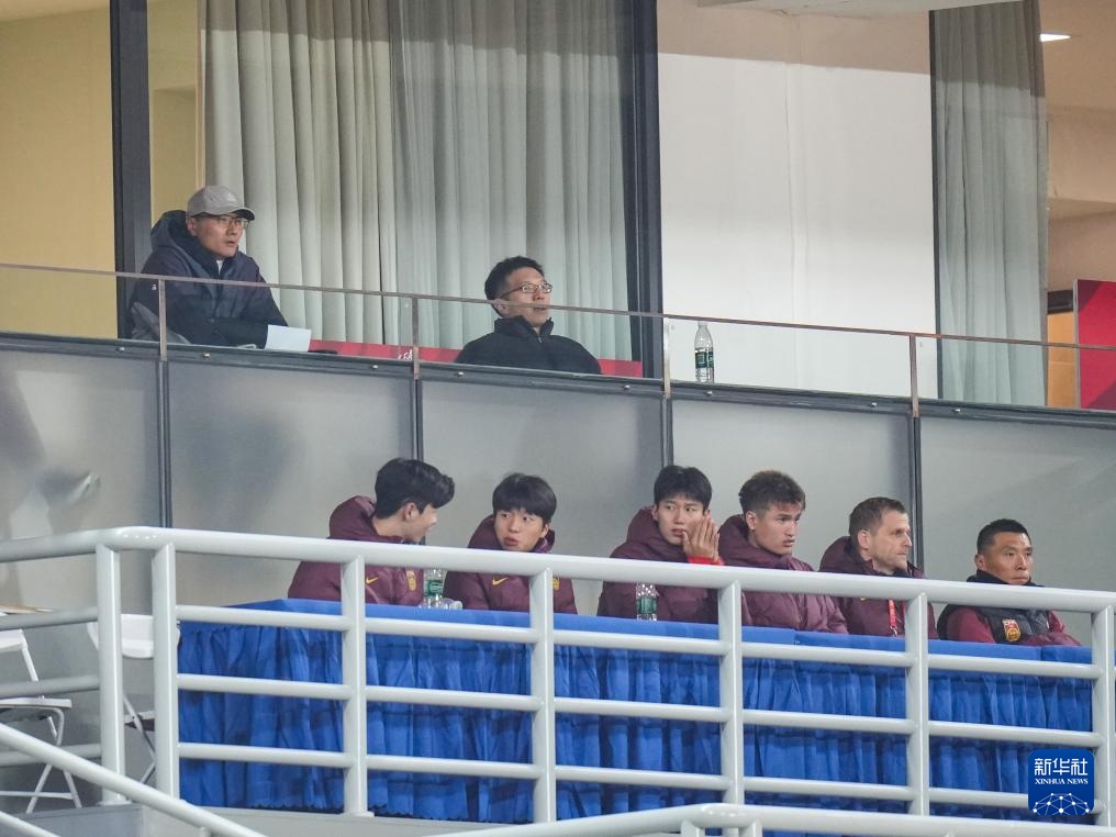 11月18日,中国足球队主教练邵佳一(上排左)在看台上观赛。