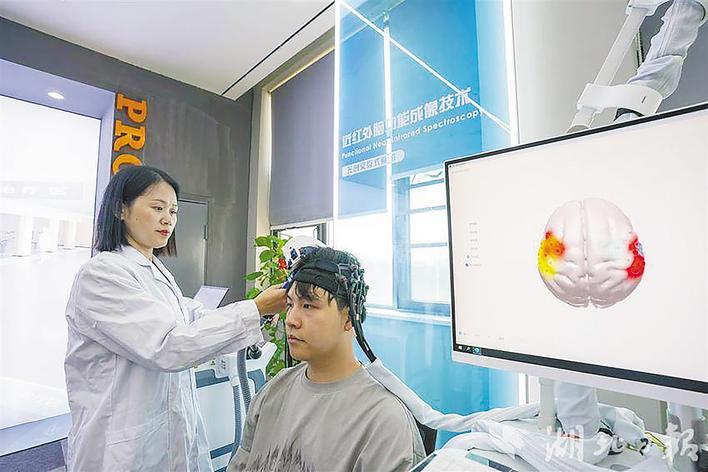 武汉依瑞德集团技术人员测试经颅磁刺激仪与近红外脑功能成像系统。 (湖北日报全媒记者 魏铼 摄)