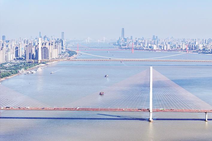 11月18日,武汉天空澄澈如洗。寒潮带来的强劲北风荡尽尘霾,长江武汉段能见度陡增,从高空俯瞰,白沙洲大桥、杨泗港大桥、鹦鹉洲大桥、长江大桥、长江二桥、二七大桥等六座跨江桥梁次第展开,形成“一眼望六桥”的壮丽画卷。江面货轮往来,“黄金水道”百舸争流。 (湖北日报全媒记者 陈少哲 摄)