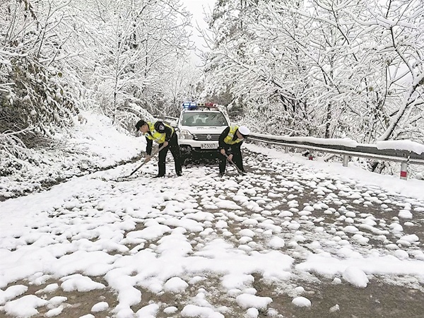16日晚9时,郧西县湖北口乡率先飘雪。至次日清晨,坎子山村积雪厚度已达12厘米。“不带防滑链上不去,一定要注意安全!”湖北口派出所民警许浩在风雪中坚守路口,一遍遍提醒过往车辆。在积雪最厚的路段,民警果断实施交通管制,牢牢守住安全第一道防线。