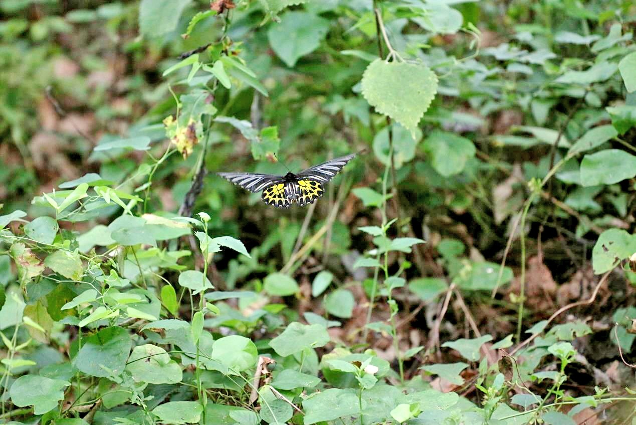 据了解,本次调查与监测由华中农业大学副教授吴刚带领队员冯蒙恩、徐杰、谭炎淋、张铎等人开展,团队在两年内进行了三次大规模野外调查。“本次昆虫多样性本底调查与监测共计调查到1174种昆虫,就我近些年了解到的数据来看,这在湖北属于非常丰富的调查数量,也说明咱们的生态环境在逐步向好和稳定。”吴刚介绍,“调查中发现的金裳凤蝶为凤蝶科翼凤蝶属,是中国体型最大的蝴蝶。其飞行姿态优美,前翅黑色,后翅金黄色和黑色交融的斑纹在阳光照射下金光灿灿,显得华贵美丽。”