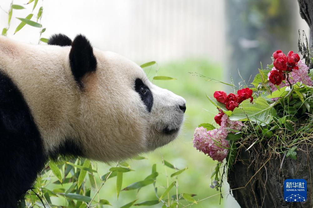 2020年8月16日,大熊猫“新星”在38岁生日会上享用水果生日蛋糕。新华社记者 唐奕 摄