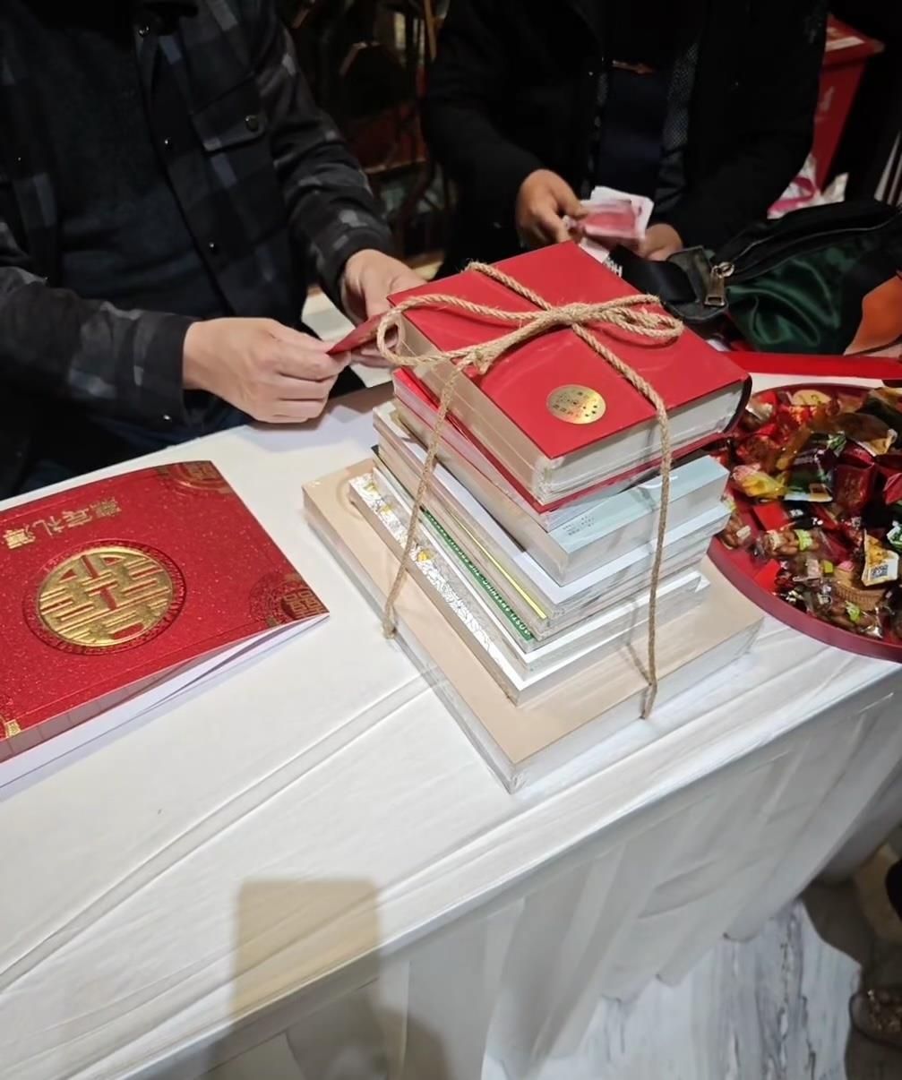 一位网友称:“哇,读书人送礼就是不俗,就是祝两人相爱相知,浪漫永续,百年好合嘛!”还有网友说:“九本书,长长久久。封面是红色的祝福。最下面祝福他百年好合,现在大家送礼越送越多,没想到还有这么有趣的灵魂。”