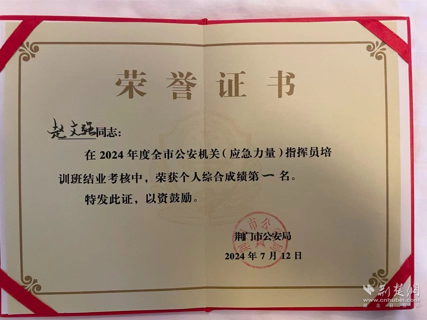 2024年7月,荆门市局组织应急力量指挥员集训,他代表分局参加。训练期间,他主动加班加点,晚上学习理论,清晨练习400米障碍。枪械拆装不熟练,他就一遍遍加练。凭着这股韧劲,赵文强最终在结业考核中取得了综合成绩第一名的好成绩。