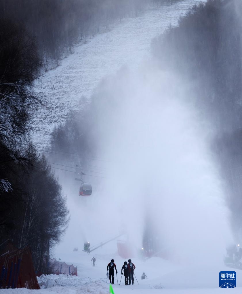 11月19日,负责赛事保障的工作人员滑雪下山。