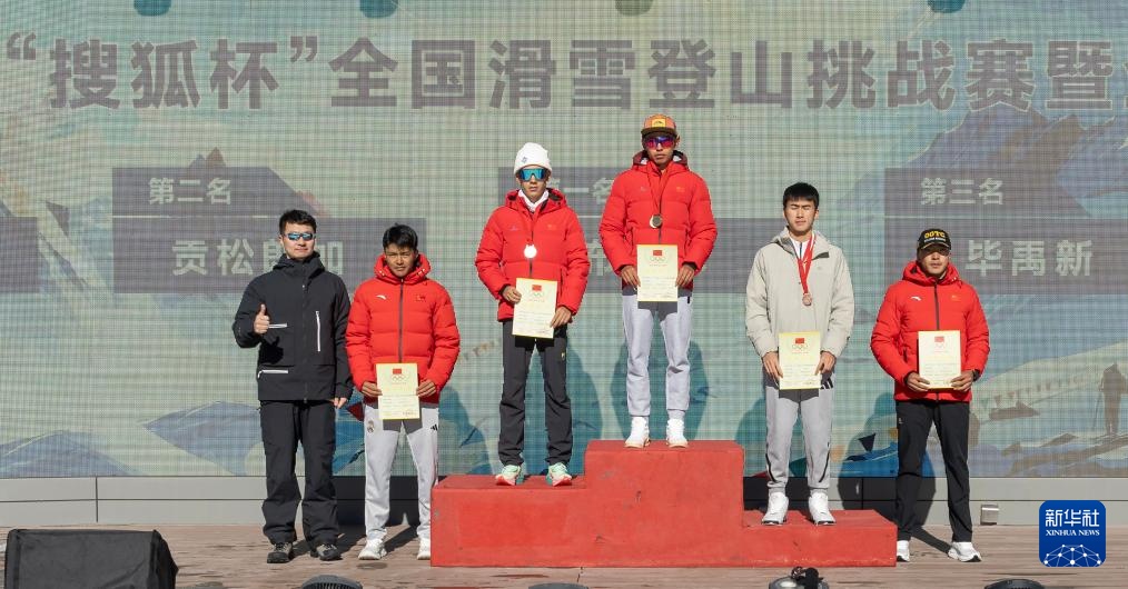 11月19日,获得垂直竞速赛男子组前五名的选手毕禹新(右三)、扎西更堆(左三)、布鲁尔(右二)、贡松郞加(左二)和次旺多吉(右一)在颁奖仪式上与颁奖嘉宾合影。