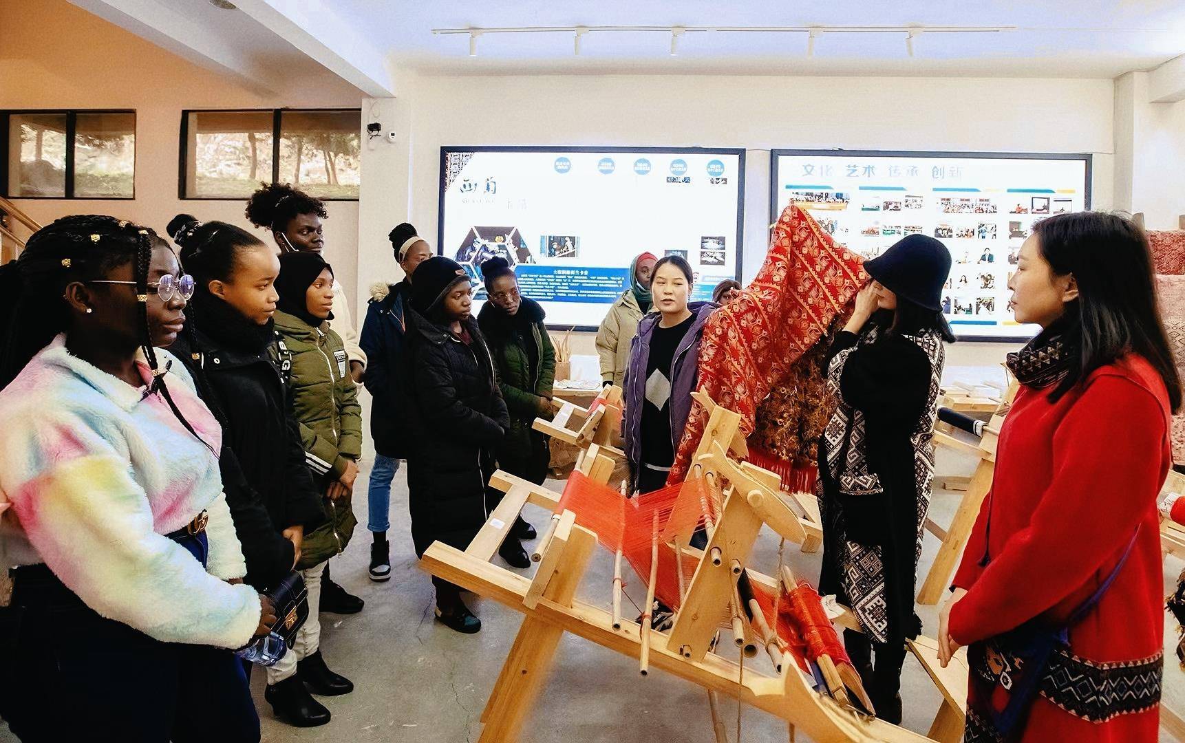 谭艳华、谭艳宾正在向外国留学生展示西兰卡普织锦技艺(受访者供图)
