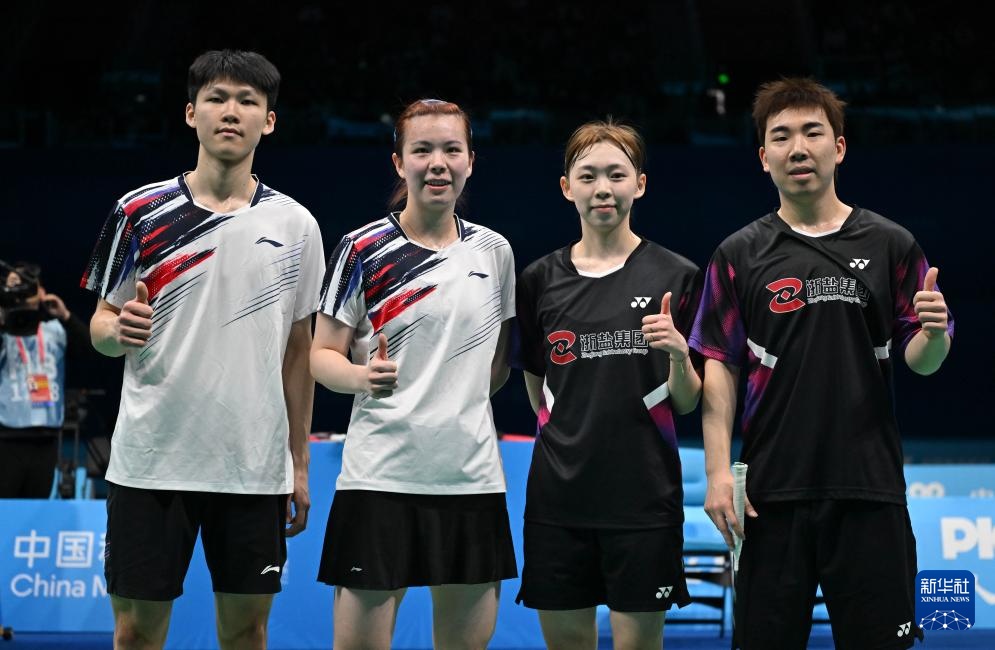 11月19日,浙江队组合郭新娃(右一)/吴梦莹(右二)、广东队组合高家炫(左一)/陈芳卉在比赛后合影。