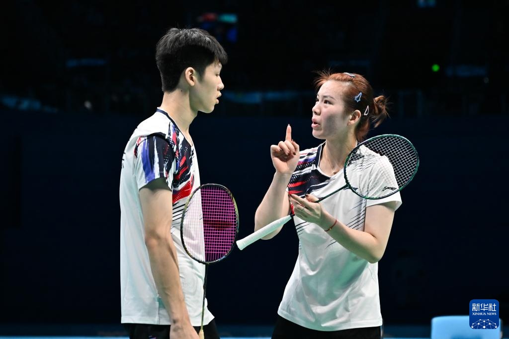 11月19日,广东队组合高家炫(左)/陈芳卉在比赛中交流战术。