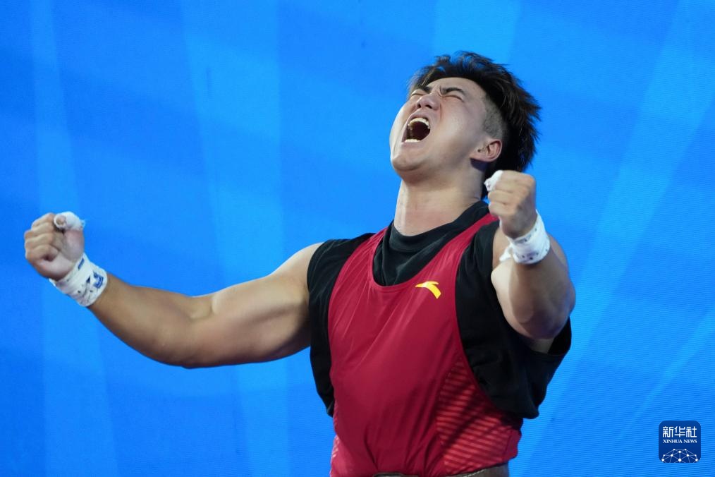11月19日,江苏队选手钱飞翔在挺举比赛中试举成功后庆祝。他获得冠军。