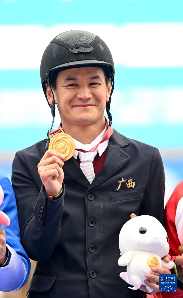 11月19日,获得冠军的广西队选手木拉得力在胜利骑乘中向观众展示金牌。