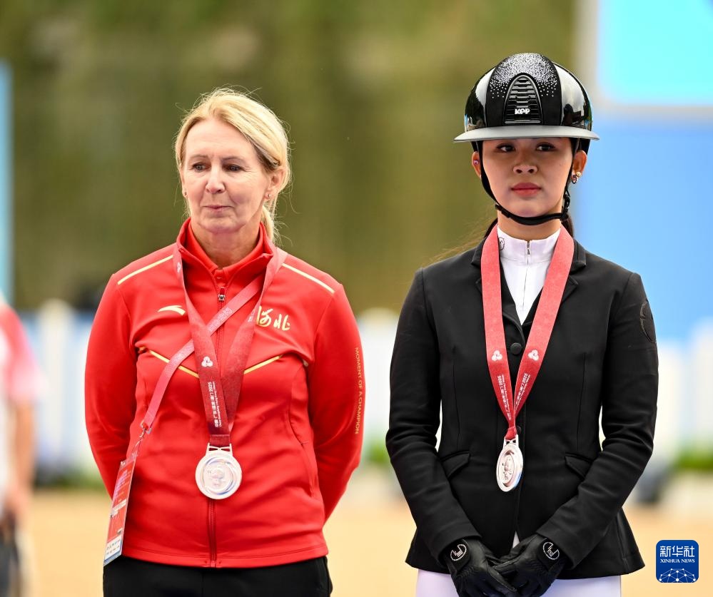 11月19日,获得亚军的河北队选手王韫婧(右)和教练在颁奖仪式上。