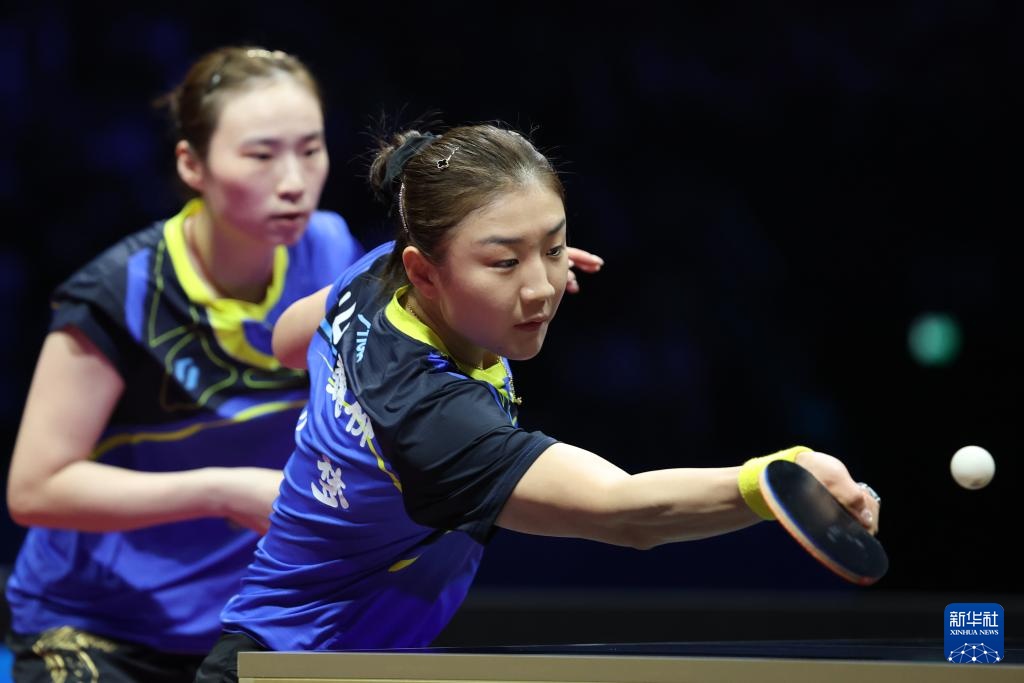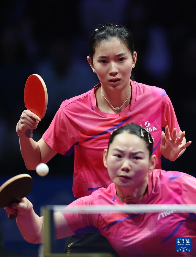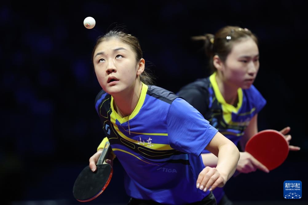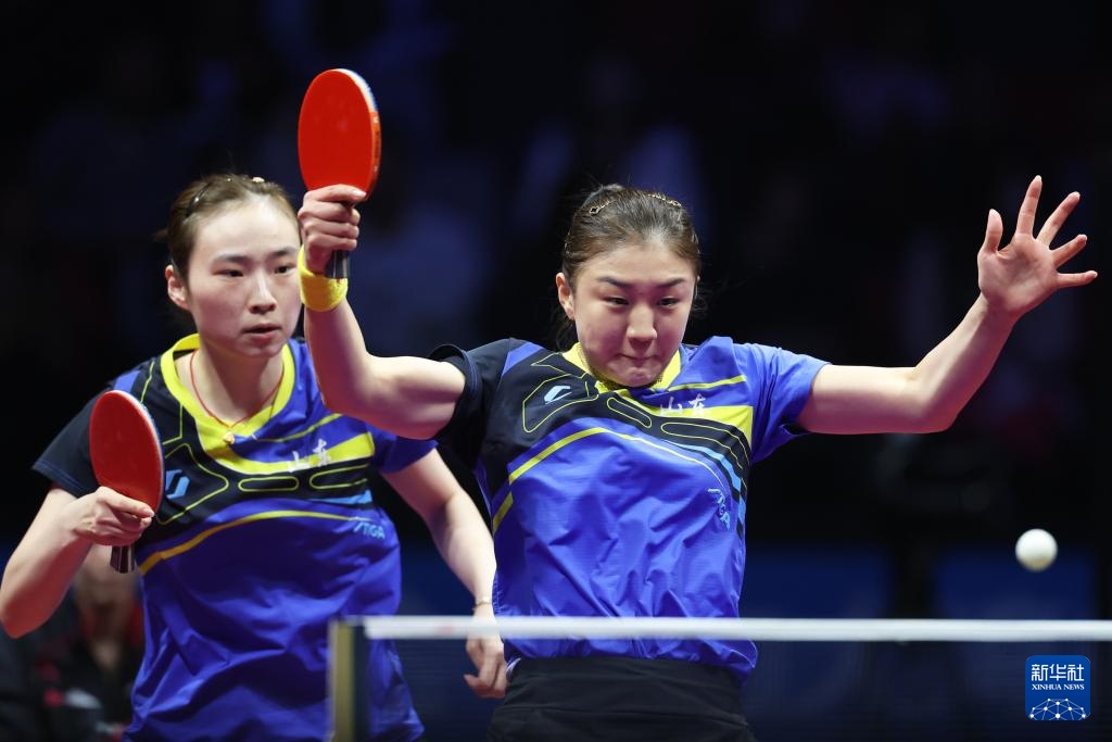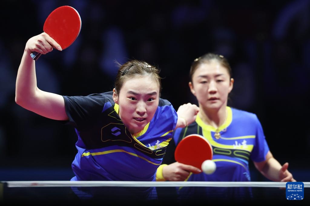 11月19日,山东队组合王晓彤(左)/陈梦在女双比赛中。最终,她们3比0战胜河北队组合何卓佳/王添艺。