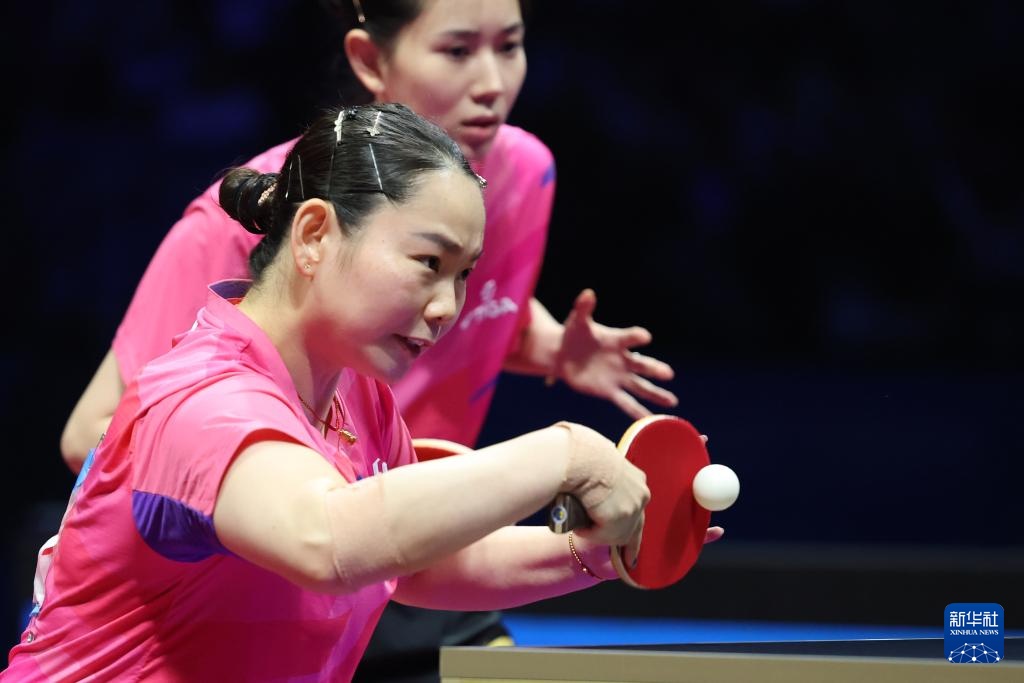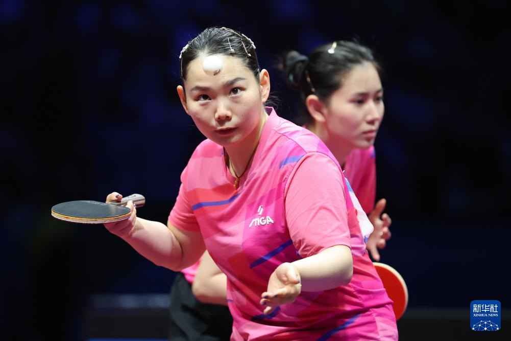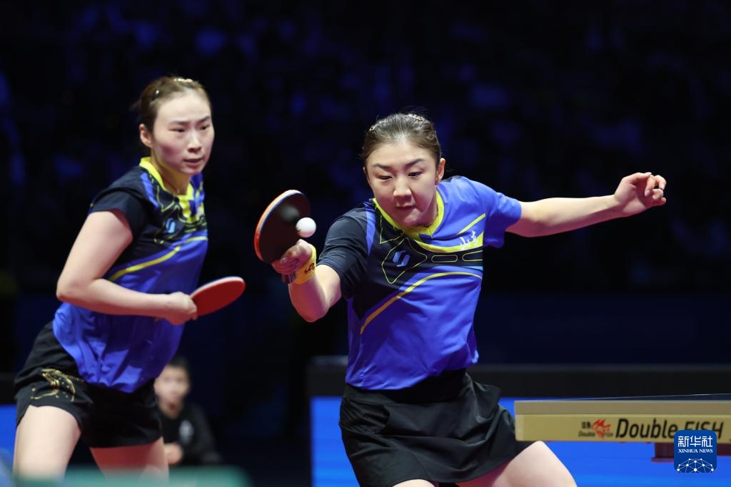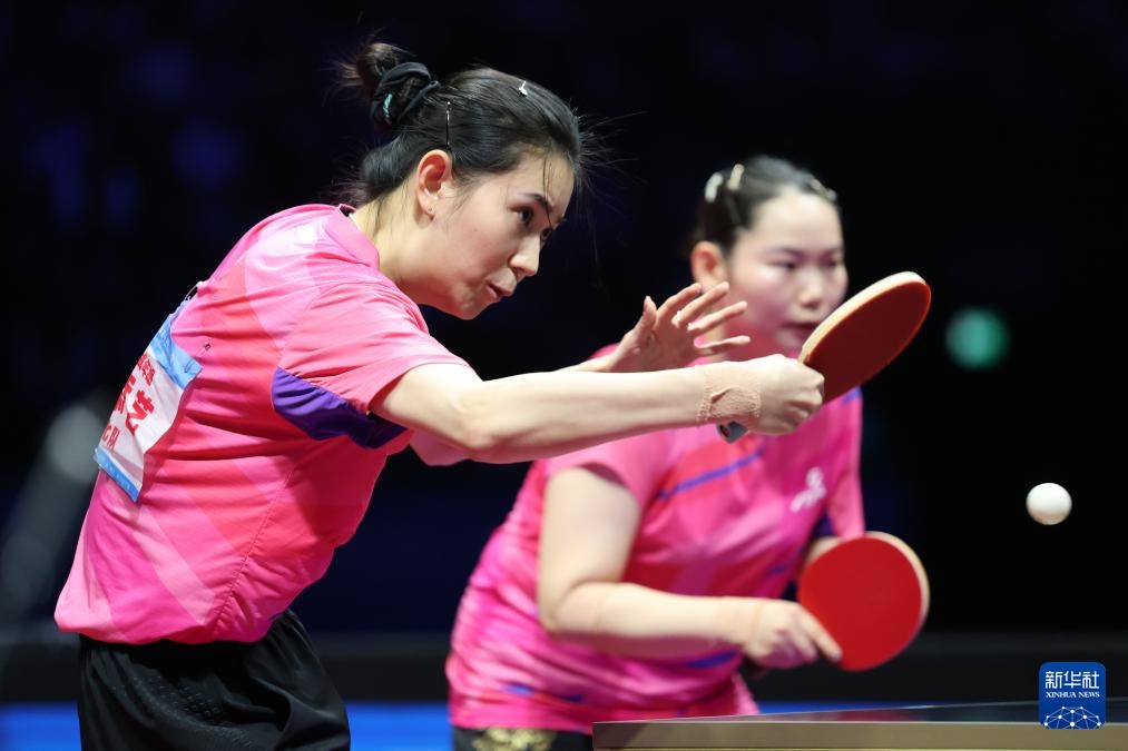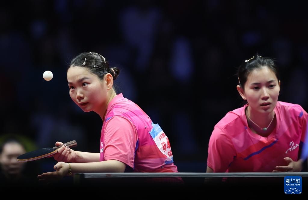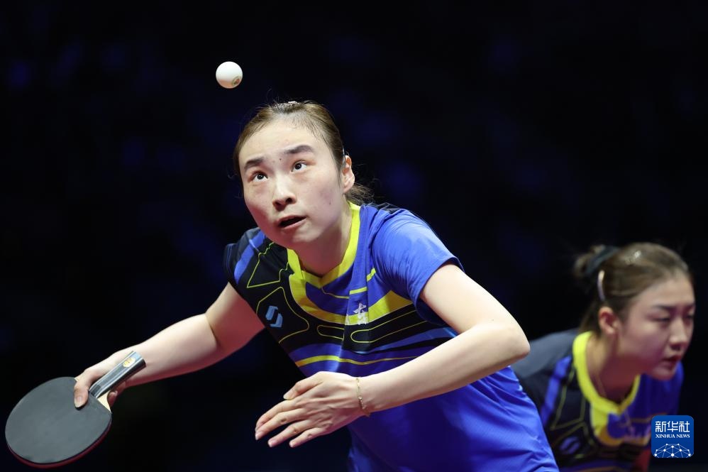11月19日,山东队组合王晓彤(左)/陈梦在女双比赛中。最终,她们3比0战胜河北队组合何卓佳/王添艺。