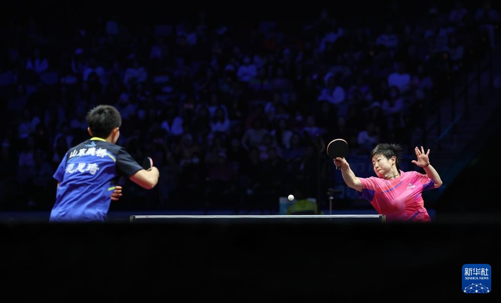 11月19日,河北队选手孙颖莎(右)在女单比赛中回球。最终,她3比1战胜山东队选手范思琦。