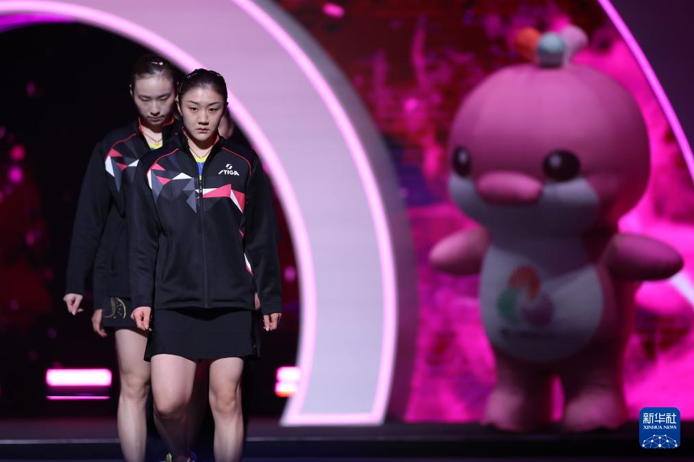 11月19日,山东队组合王晓彤/陈梦(右)在比赛前入场。她们对阵河北队组合何卓佳/王添艺。