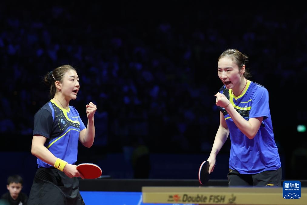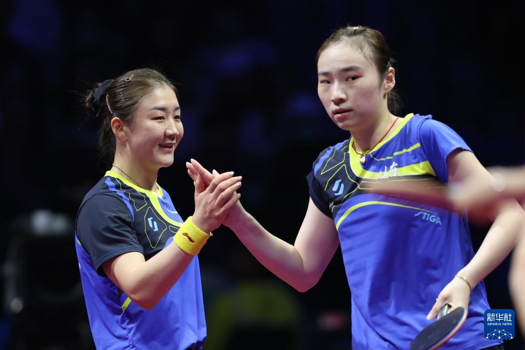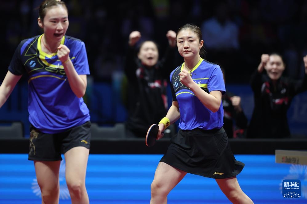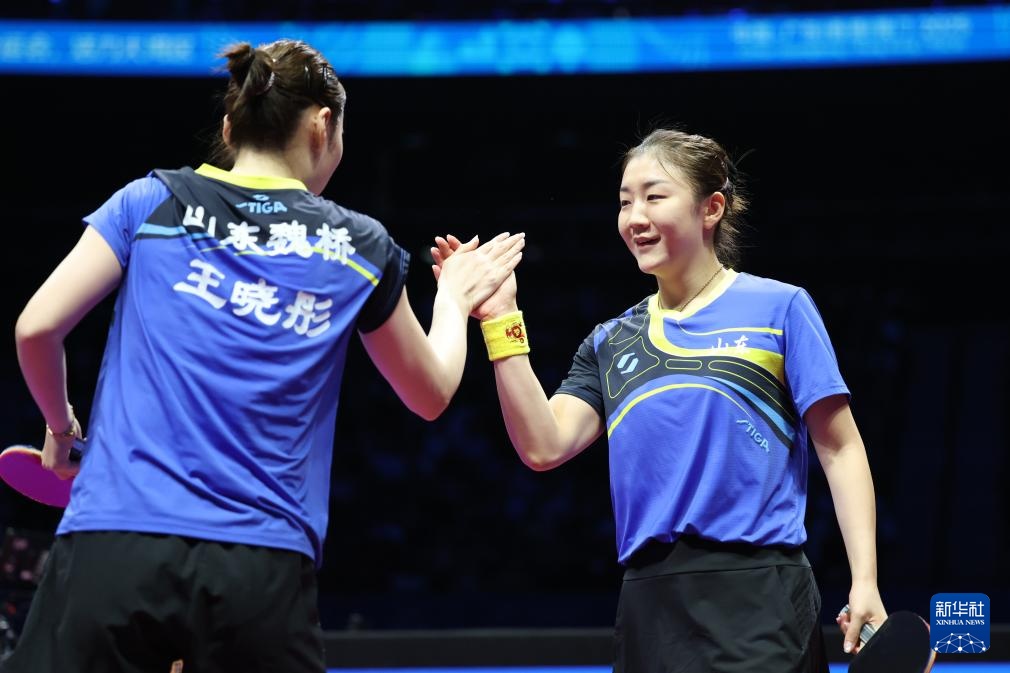 11月19日,山东队组合王晓彤/陈梦(左)在女双比赛中庆祝。她们3比0战胜河北队组合何卓佳/王添艺。