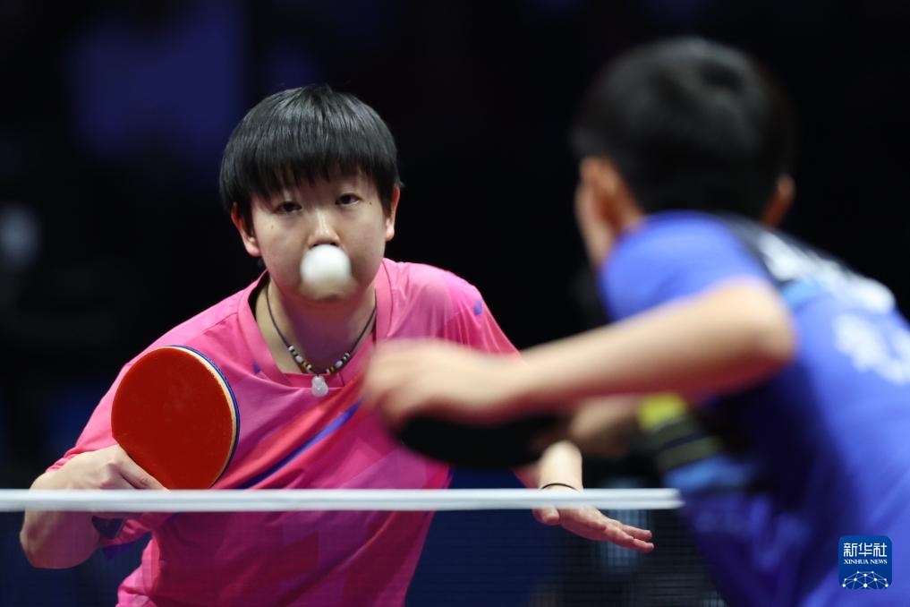 11月19日,河北队选手孙颖莎(左)在女单比赛中回球。最终,她3比1战胜山东队选手范思琦。