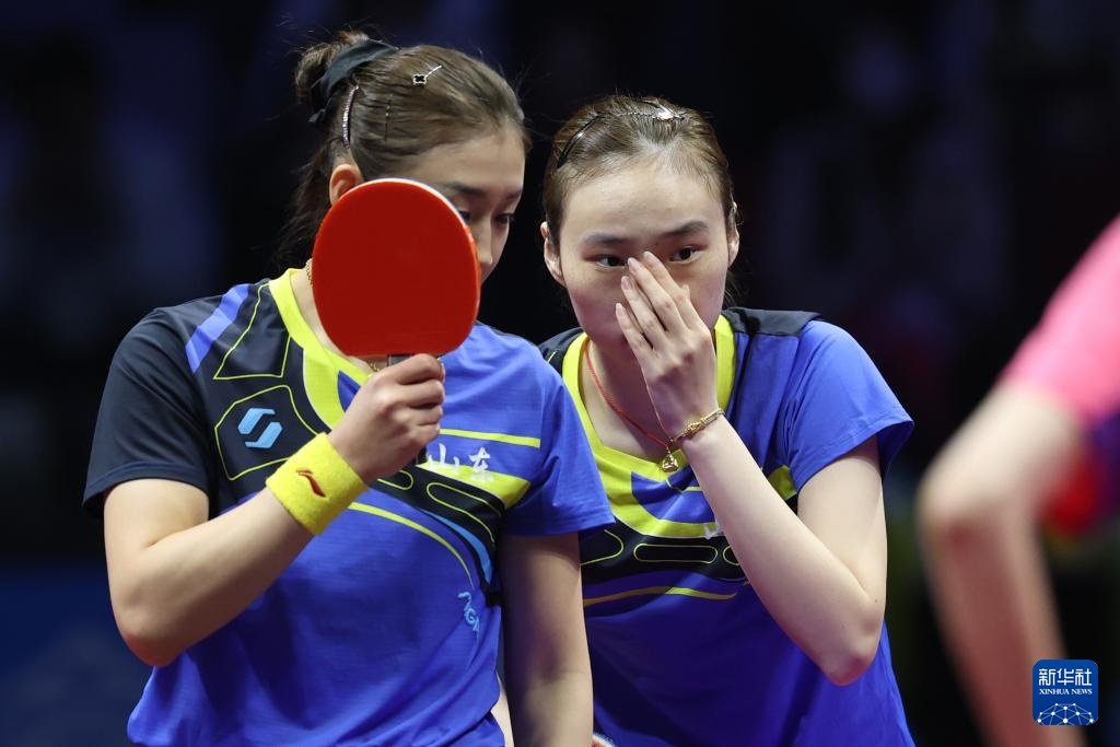 11月19日,山东队组合王晓彤/陈梦(左)在女双比赛中商讨战术。最终,她们3比0战胜河北队组合何卓佳/王添艺。