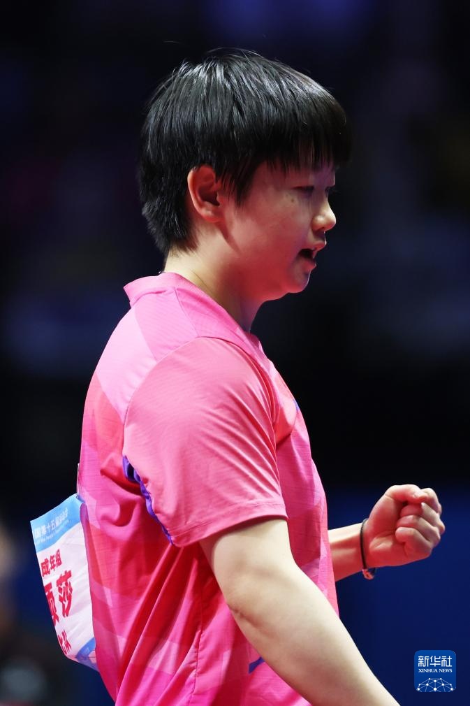 11月19日,河北队选手孙颖莎在女单比赛中庆祝得分。最终,她3比1战胜山东队选手范思琦。