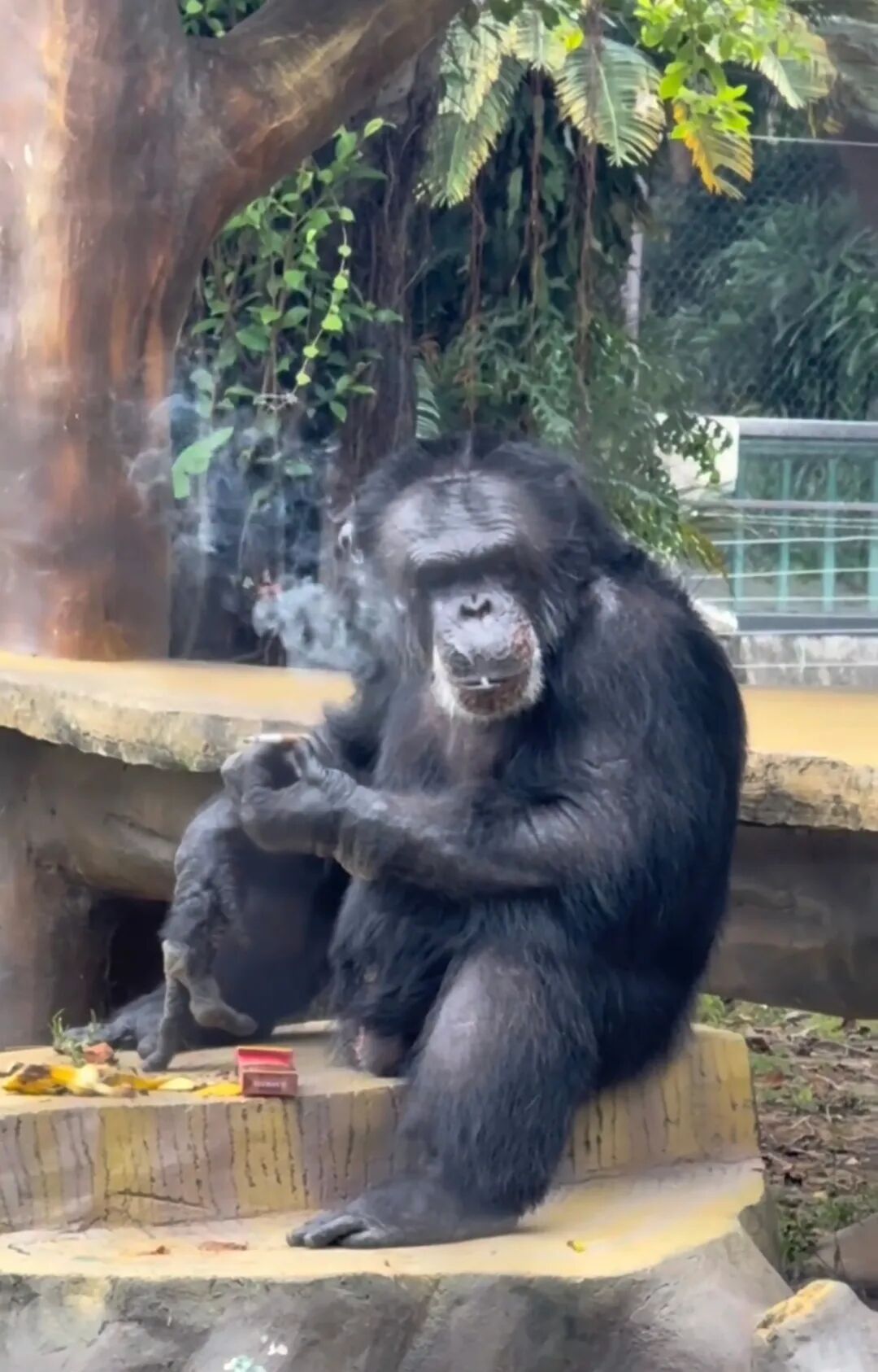 有网友在评论区介绍,这只抽烟的黑猩猩是南宁动物园著名的“屎丢夫·丢那猩”(原名:彼夫克),此前因向游客投掷粪便“走红”。