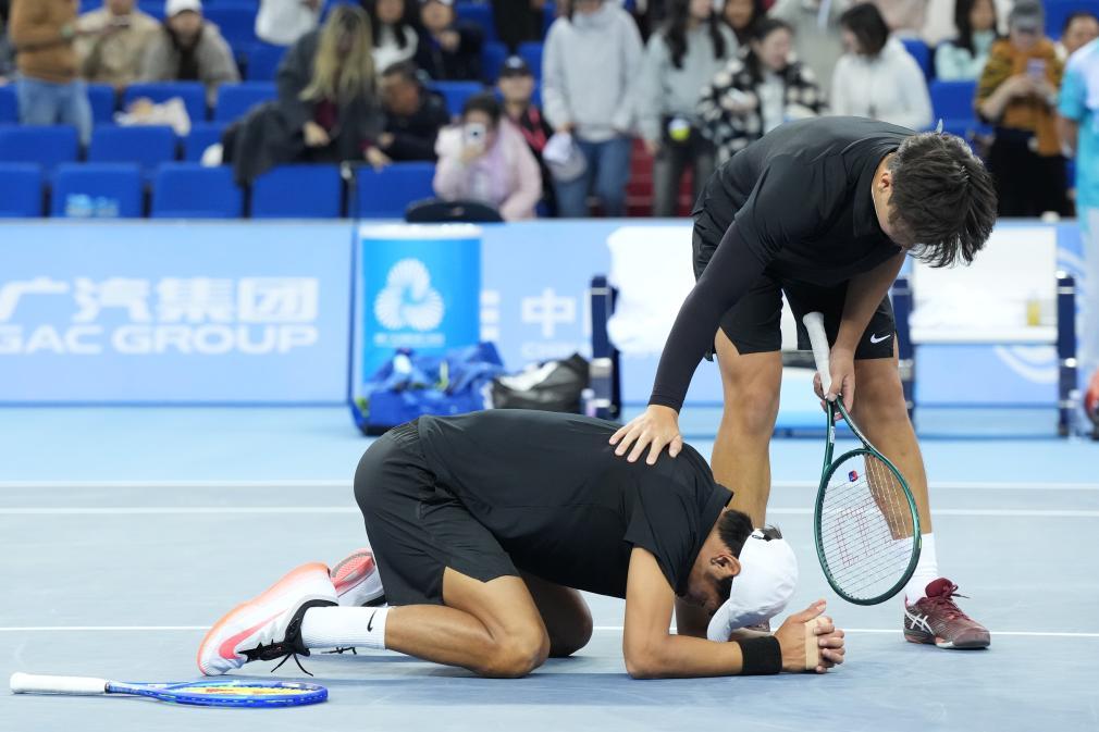赛前表示“志在夺冠”的浙江队吴易昺,此役迎战二号种子、香港队黄泽林。第一盘黄泽林8:6拿下“抢七”。第二盘双方继续“抢七”:吴易昺5:1领先后被追至6:6,在9:7惊险“续命”后,他双手掩面蹲在场地中央久久不能起身。决胜盘吴易昺尽显名将风范,以6:4力克黄泽林更进一步。