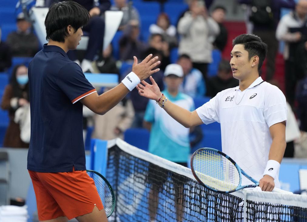 11月19日,北京队选手商竣程(右)与广西队选手周意在比赛后握手致意。新华社记者 颜麟蕴 摄