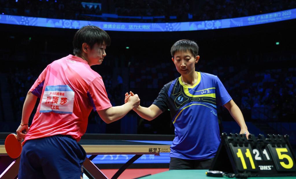 11月19日,河北队选手孙颖莎(左)与山东队选手范思琦在女单比赛后握手致意。孙颖莎3:1战胜范思琦。新华社记者 梁旭 摄