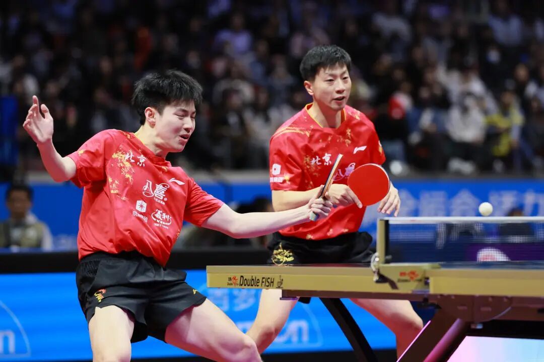 △乒乓球男团半决赛,北京队马龙/黄友政在比赛中。