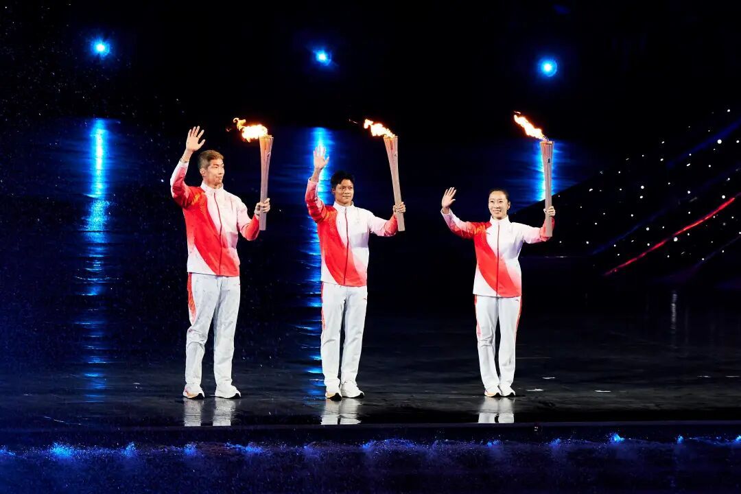△苏炳添担任十五运会开幕式火炬手,点燃主火炬。