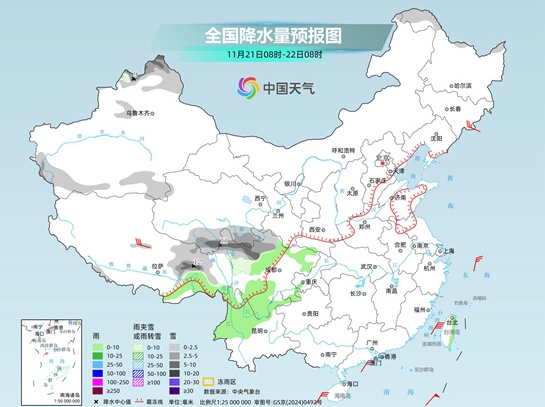 明天,黑龙江北部、新疆北疆北部和南疆盆地南部、西藏东部、青海南部、川西高原北部等地部分地区有小到中雪或雨夹雪,其中,新疆北疆北部、西藏东部、青海南部、川西高原北部等地局地有大到暴雪。