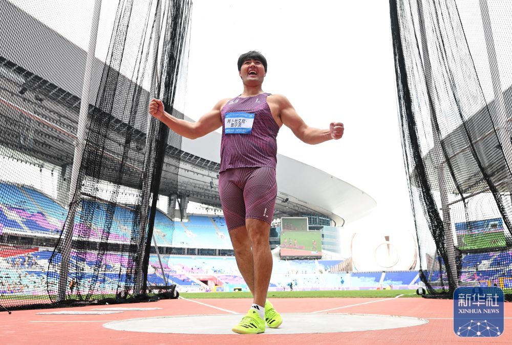 ↑ 新疆队选手阿卜杜艾尼·图尔贡在试投后庆祝。他以64米40的成绩夺得冠军。新华社记者 江汉 摄