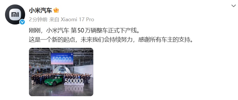 11月20日,@小米汽车 宣布:刚刚,小米汽车第50万辆整车正式下产线。这是一个新的起点,未来我们会持续努力,感谢所有车主的支持。