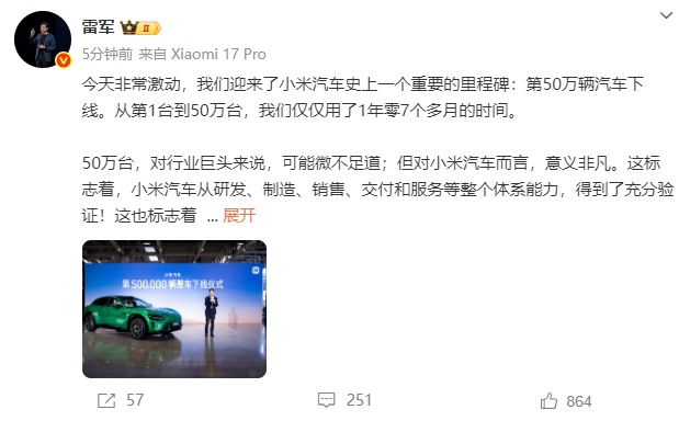 今天非常激动,我们迎来了小米汽车史上一个重要的里程碑:第50万辆汽车下线。从第1台到50万台,我们仅仅用了1年零7个多月的时间。