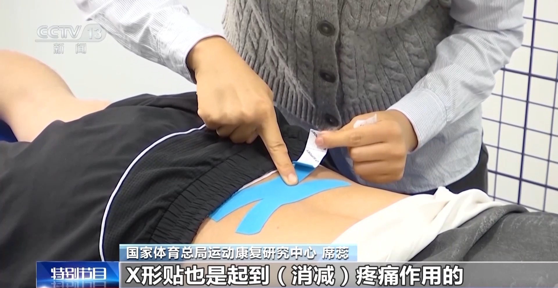 国家体育总局运动康复研究中心 席蕊:一般在贴的时候,固定的锚点都要剪成弧形的,不同的剪法就是,大家能看到的可能有I形、Y形、灯笼形、爪形等,不同的形状是根据不同的需求来的,比如爪形和灯笼形一般是用来消肿和止疼的,I形和Y形一般是作用于肌肉功能的,起到激活或放松的目的,X形贴也起到消减疼痛的作用。