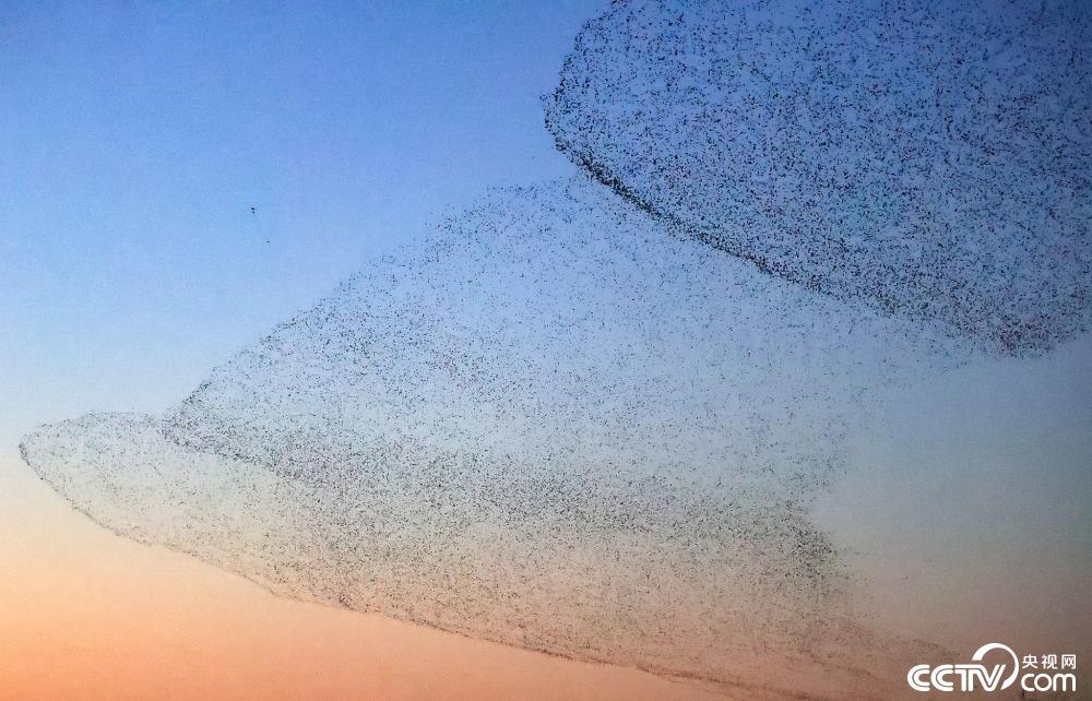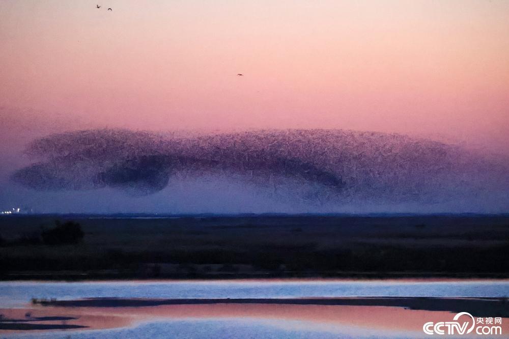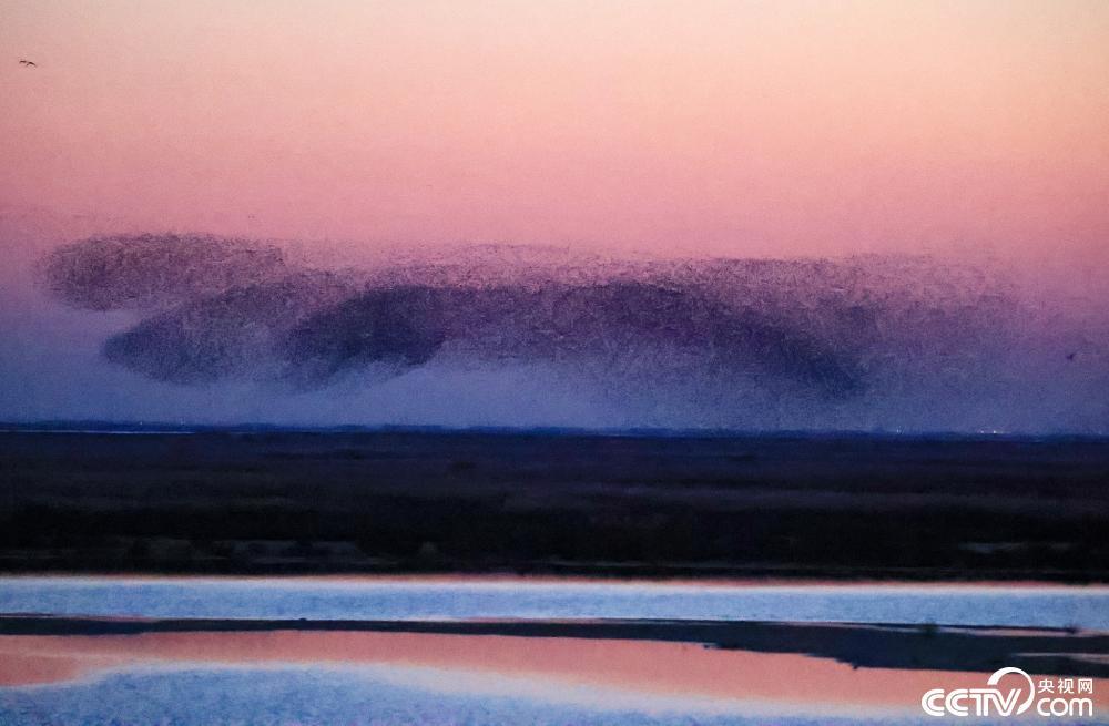 11月19日,山东省东营市,黄河口湿地上空上演鸟浪景观。