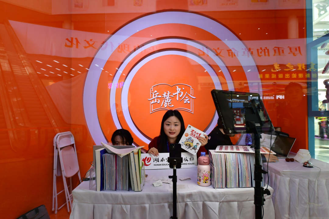 ▲现场,中南出版传媒集团旗下各出版机构在“麓山读书直播间”轮番开播。