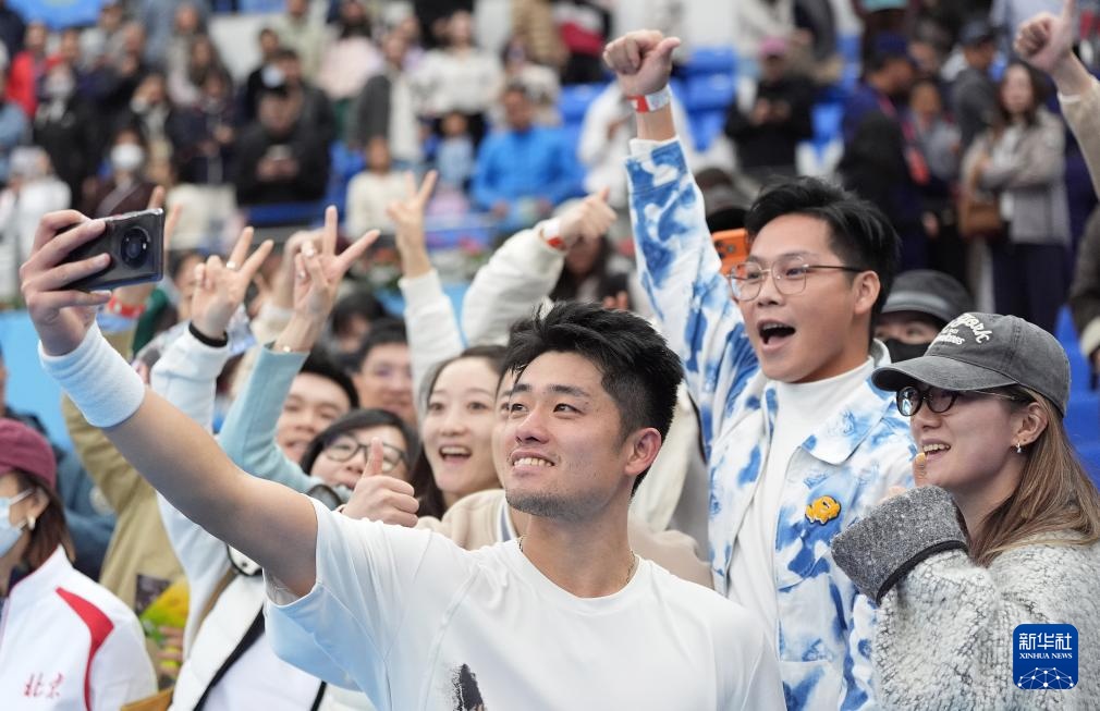 11月20日,浙江队选手吴易昺(前)在赛后与观众合影。