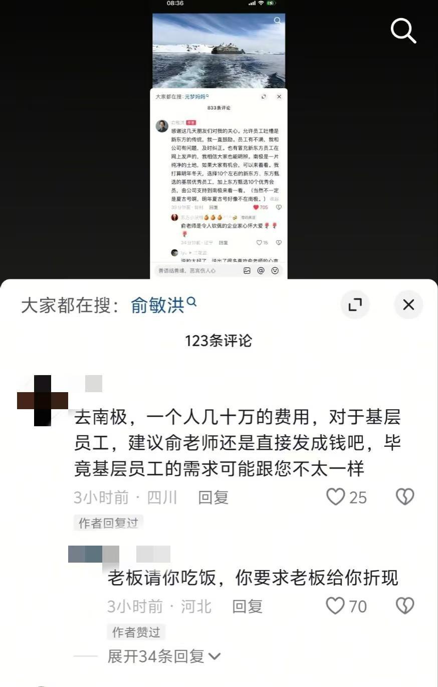 极目新闻记者注意到,有网友在评论区表示建议俞老板直接折算成现金。“去南极一个人几十万的费用,对于基层员工,建议俞老师还是直接发成钱吧,毕竟基层员工的需求可能不太一样。”“作为普通打工者,我在意的是工资是否准时到账,我出去玩也没想过要带老板。”
