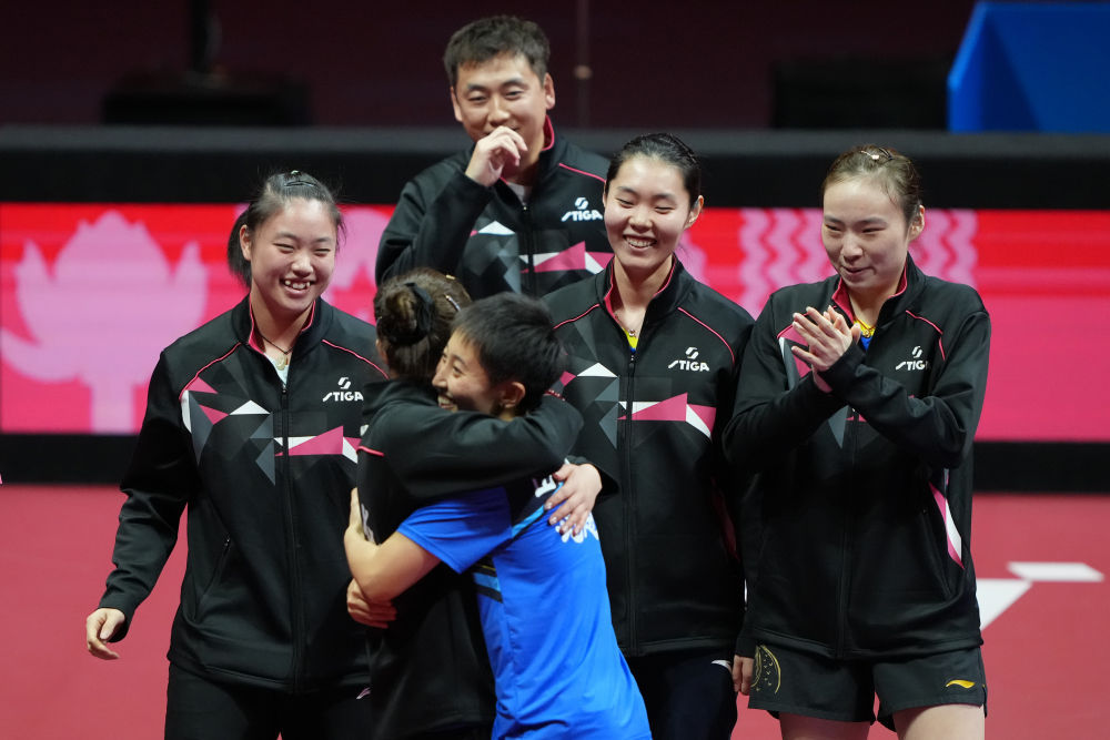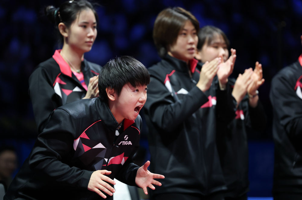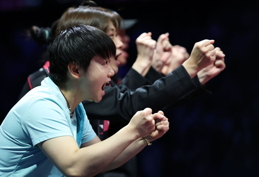 ↑ 河北队选手孙颖莎(左一)和队友在场边为河北队选手何卓佳助威。 新华社记者 梁旭 摄