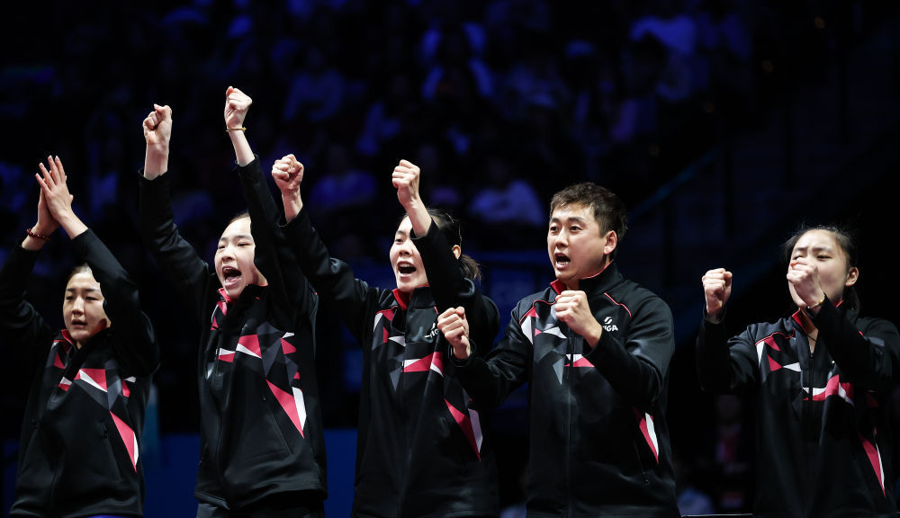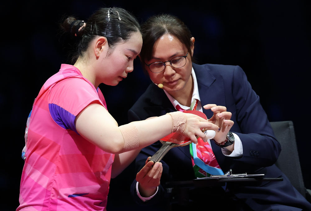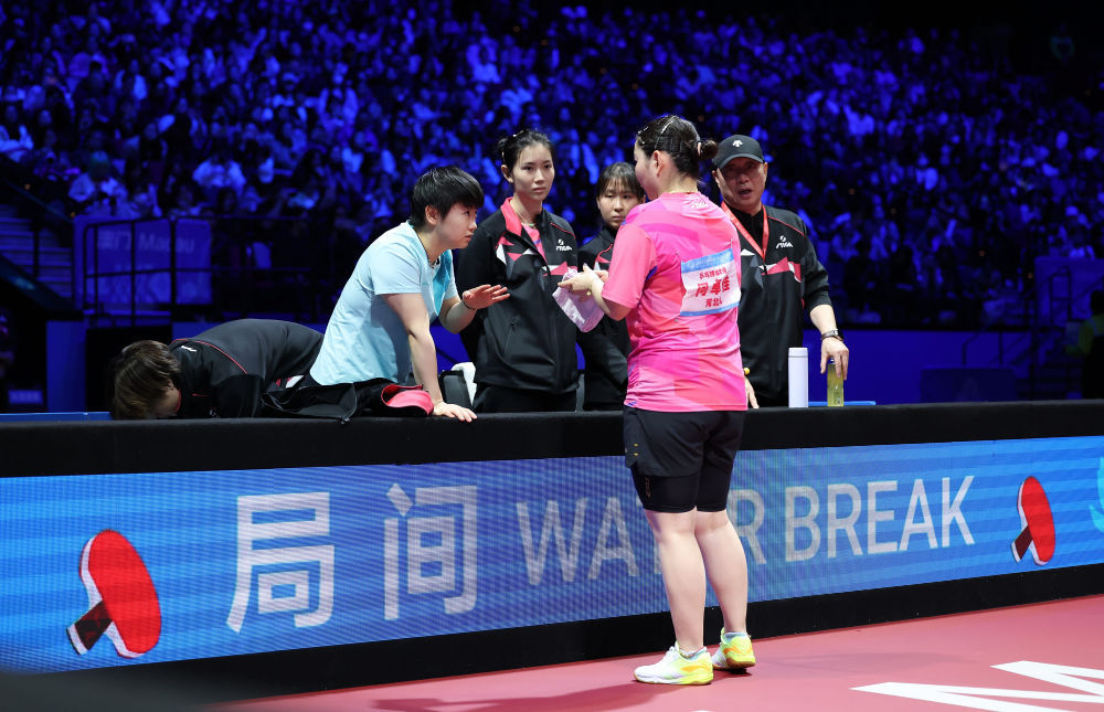 ↑ 河北队选手何卓佳(前右)在女单比赛中与团队沟通。 新华社记者 梁旭 摄