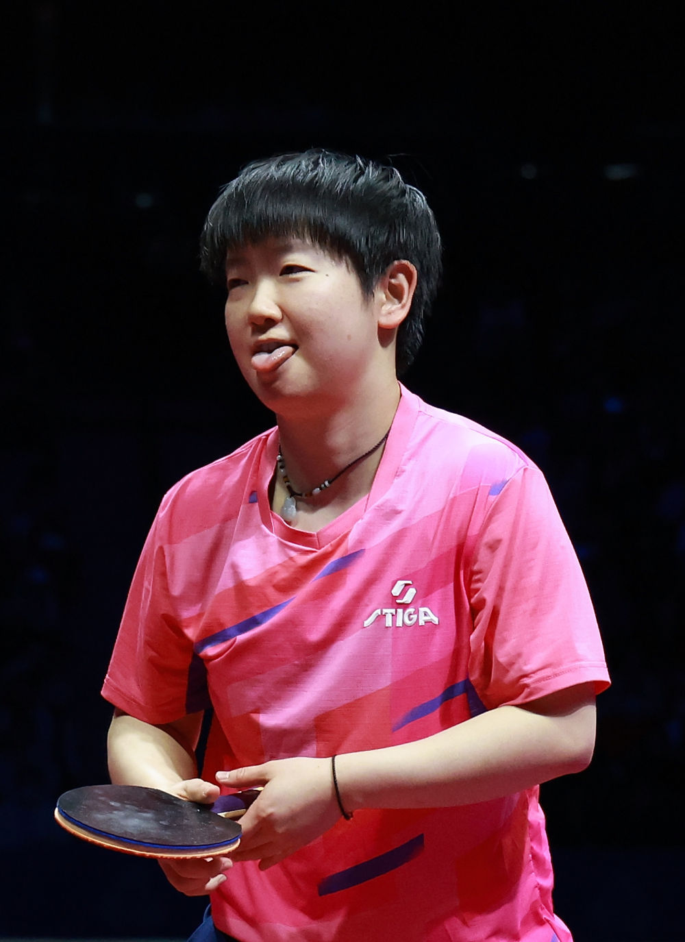 ↑ 河北队选手孙颖莎在女单比赛中。最终,她3比1战胜山东队选手范思琦。 新华社记者 梁旭 摄