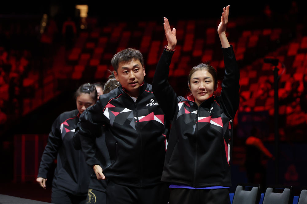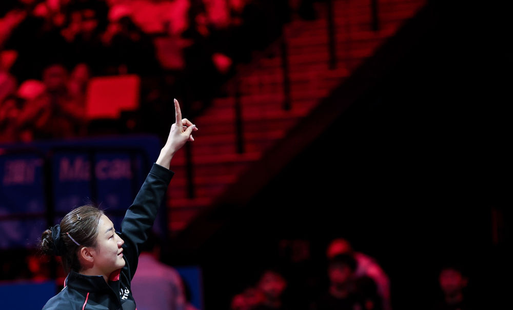 ↑ 山东队选手陈梦(右)在比赛后向观众致意。 新华社记者 刘续 摄