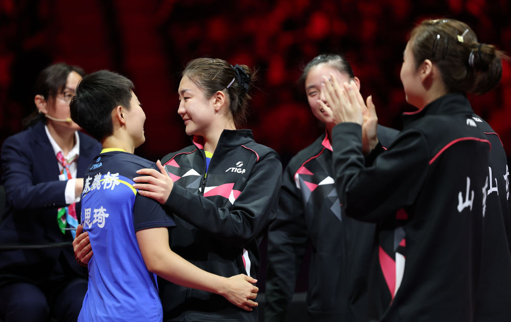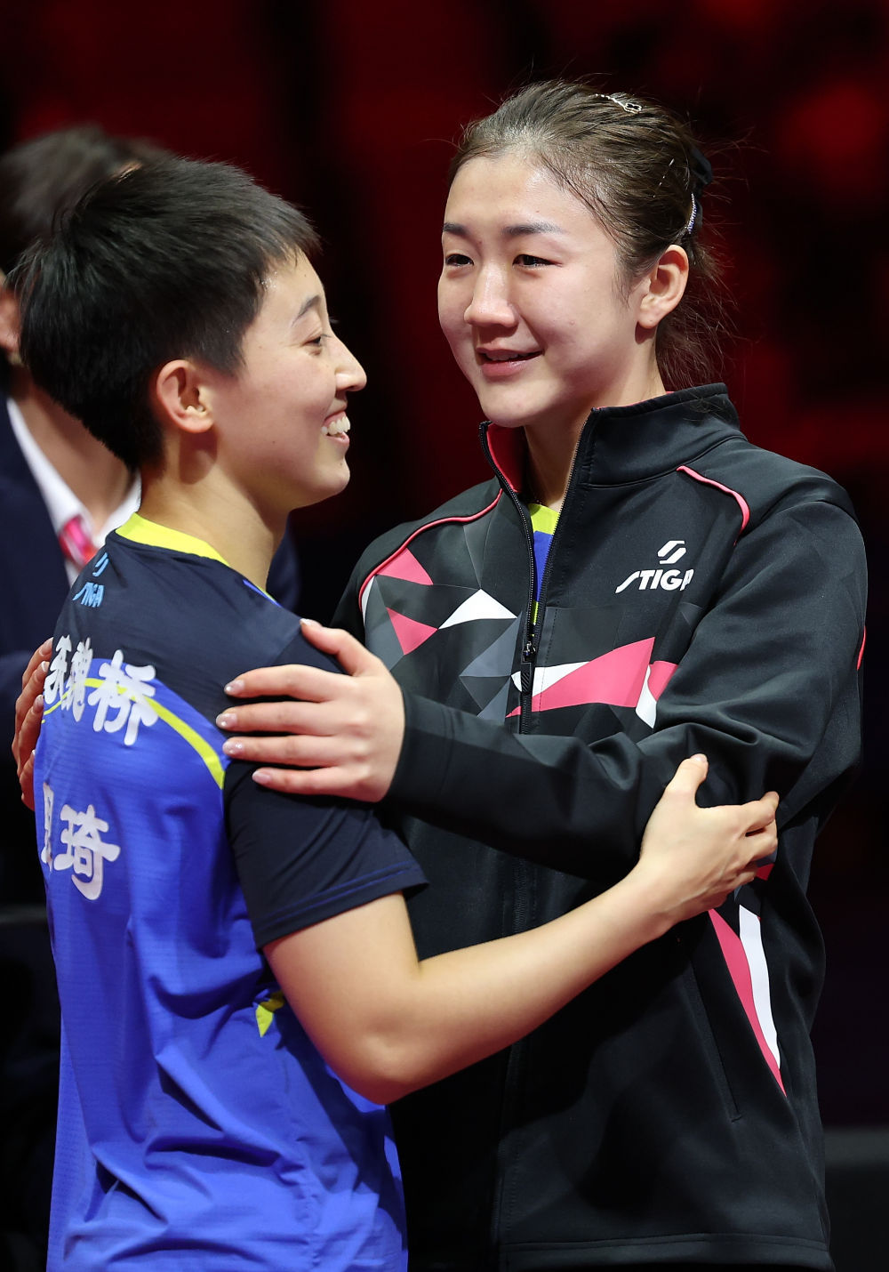 ↑ 河北队选手孙颖莎(左)与山东队选手范思琦在女单比赛后握手致意。孙颖莎3比1战胜范思琦。 新华社记者 梁旭 摄