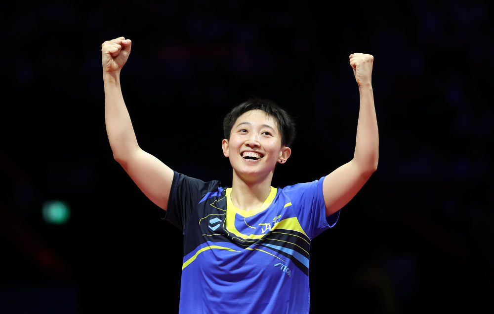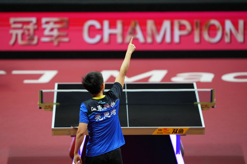 ↑ 山东队选手范思琦庆祝比赛获胜。她在女单比赛中3比2战胜河北队选手何卓佳。 新华社记者 梁旭 摄