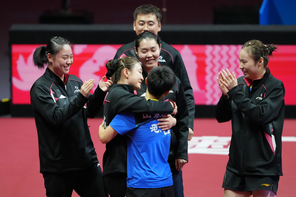 ↑ 山东队选手范思琦(左二)和队友陈梦(左三)庆祝夺冠。范思琦在女单比赛中3比2战胜河北队选手何卓佳。 新华社记者 梁旭 摄