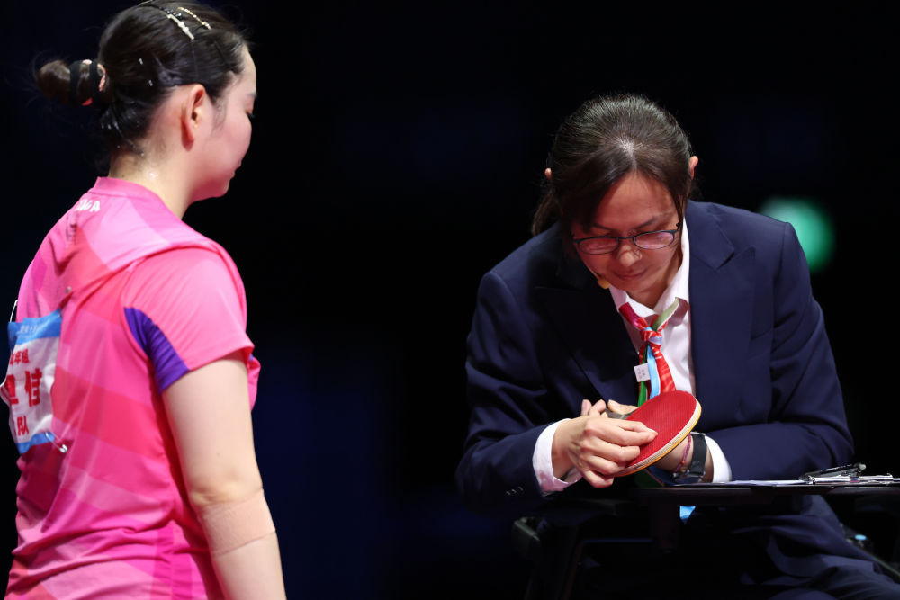 ↑ 裁判在比赛中查看河北队选手何卓佳(左)的球拍。 新华社记者 梁旭 摄