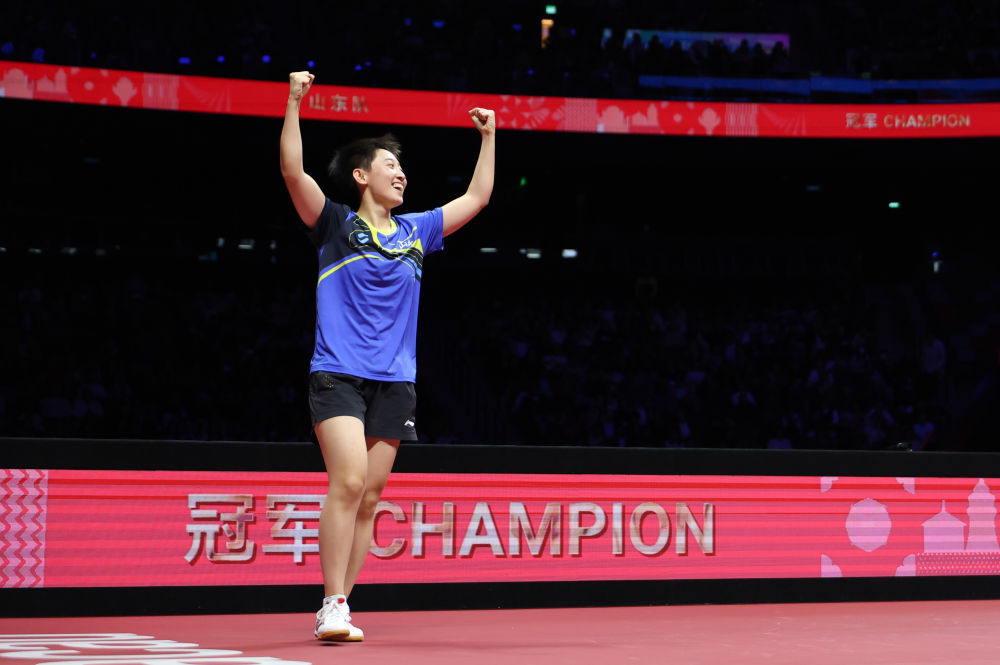 ↑ 山东队选手陈梦在比赛后庆祝夺冠。 新华社记者 梁旭 摄