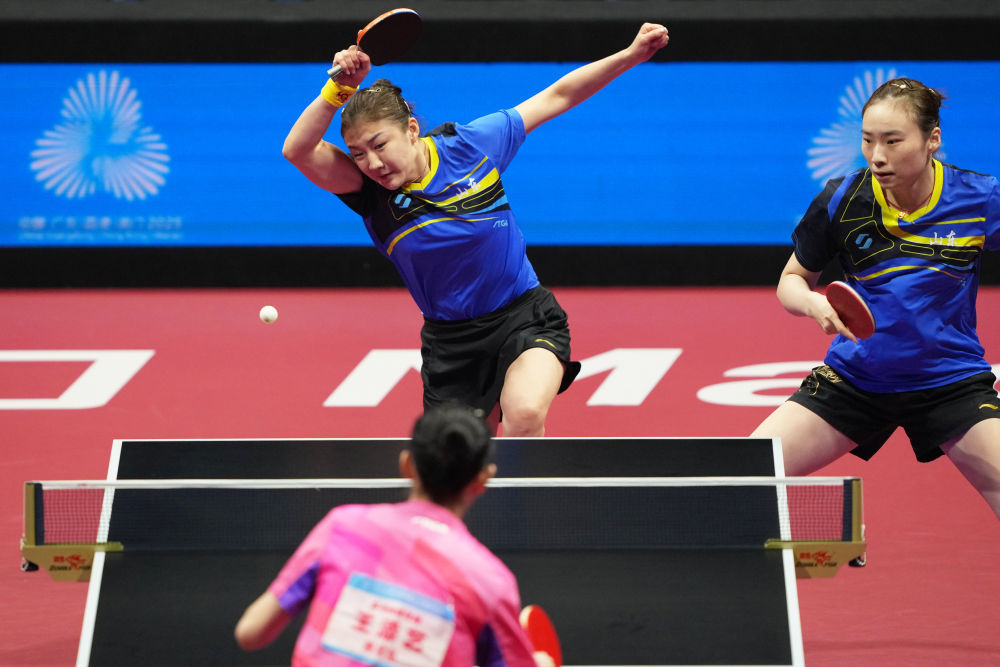 ↑ 山东队组合王晓彤/陈梦(上左)在比赛中。最终,她们3比0战胜河北队组合何卓佳/王添艺。 新华社记者 周密 摄